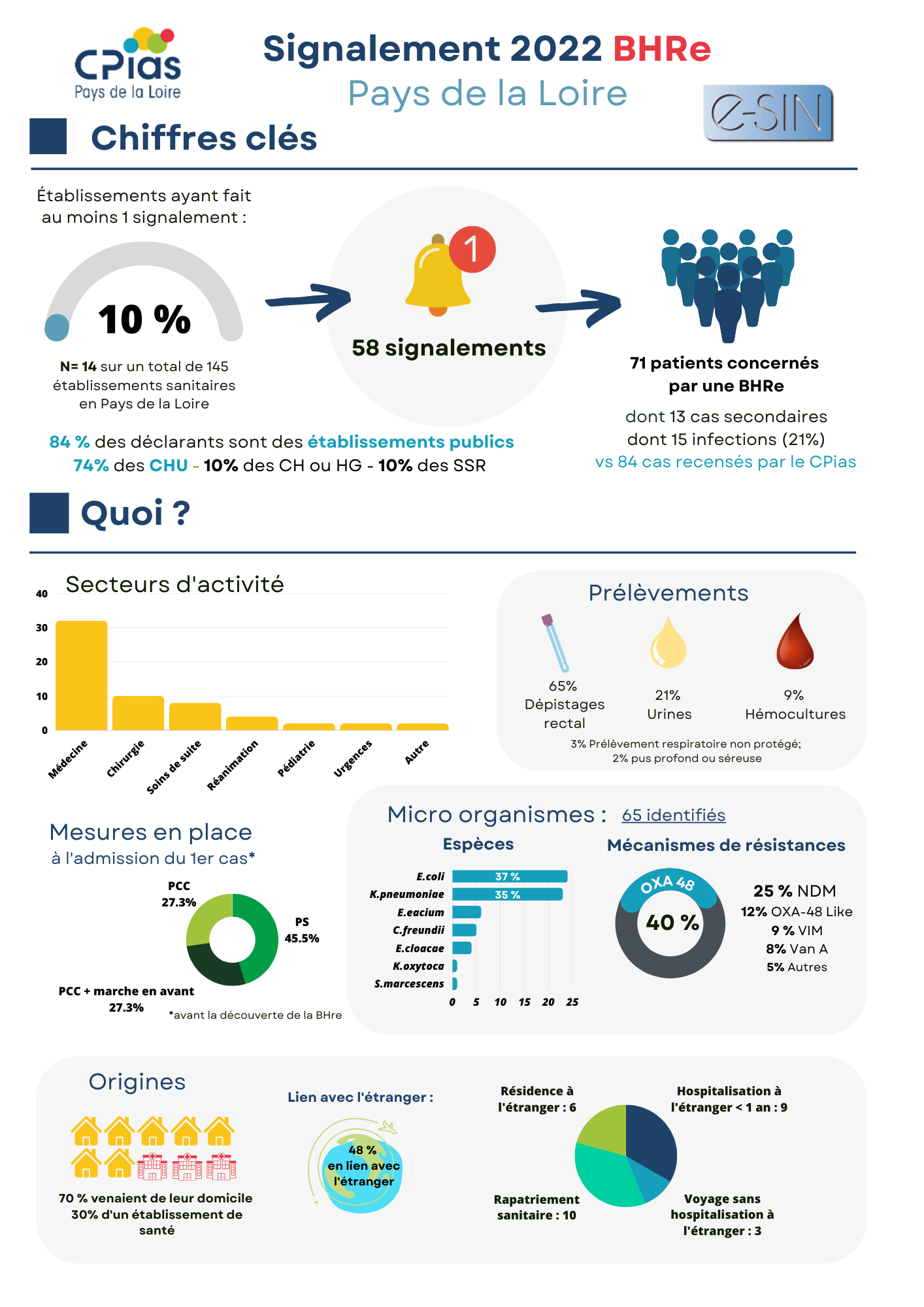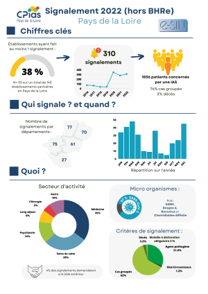 Découvrez dans notre infographie le bilan des signalements de Bactéries Hautement Résistantes émergentes (BHRe) reçus en 2022 via e-sin pour la région Pays de la Loire.
